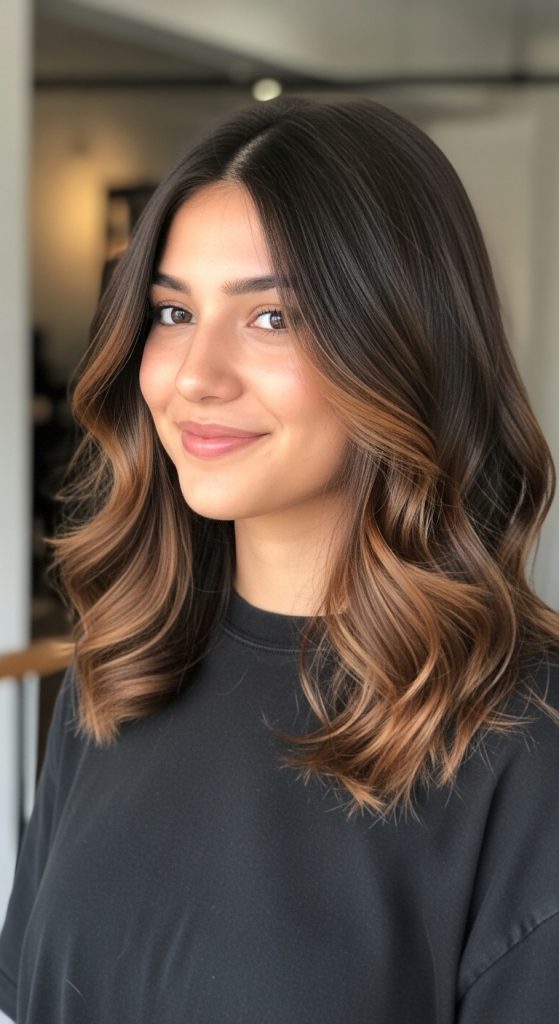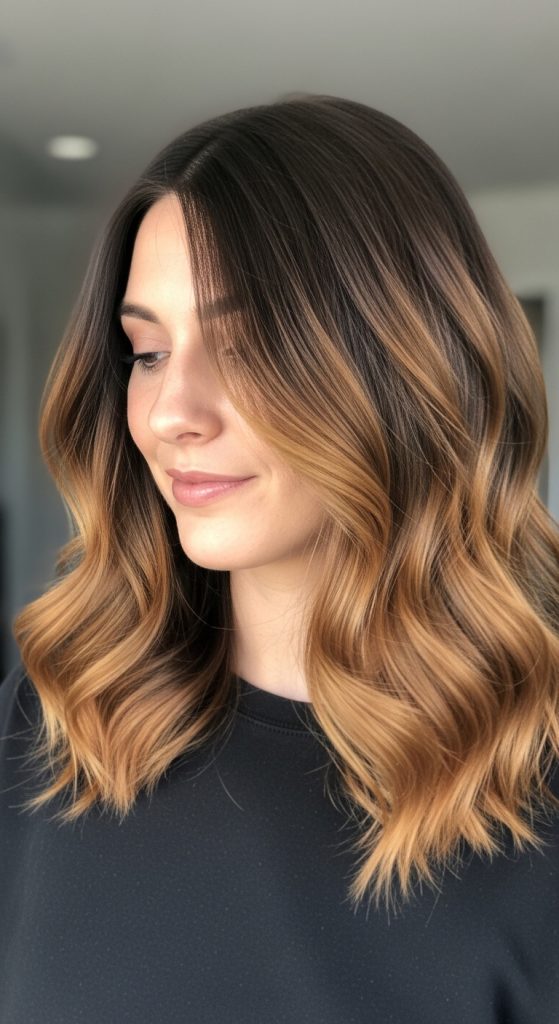 Caramel brown ombre creates a soft, warm effect by blending rich chocolate brown roots into caramel tones. This style is particularly flattering for warm skin tones and adds a sun-kissed look without requiring frequent salon visits.