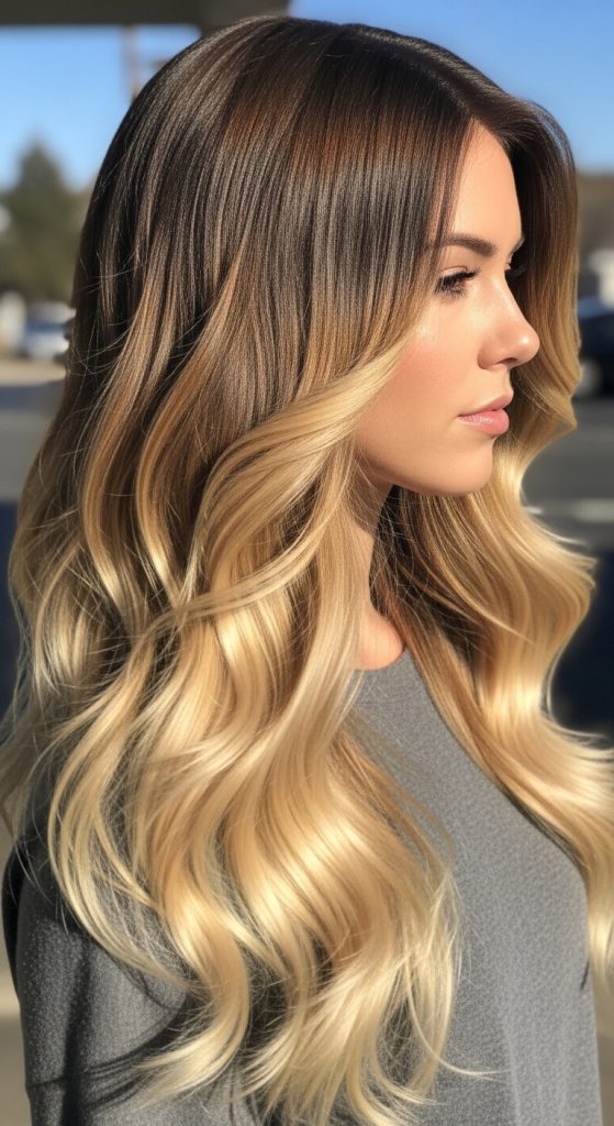 This dramatic ombre transitions from dark brown roots to blonde ends. It offers a striking contrast and works well for those seeking a bold, statement-making hairstyle.