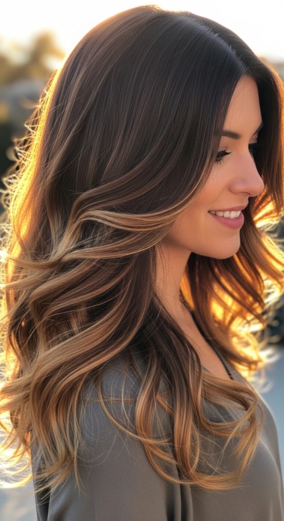 Caramel highlights within a brown ombre add dimension and shine to the hair. This style is perfect for adding depth without a complete color change.