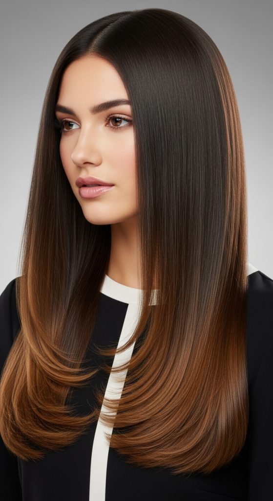 Chocolate brown ombre combines rich, deep brown roots with a slightly lighter chocolate hue toward the ends. This style is elegant and enhances the hair’s natural shine, making it perfect for professional and casual settings.