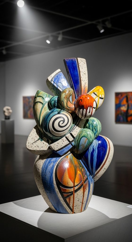 Abstract ceramic art pieces focus on creativity without strict rules. Begin with an idea or concept, then shape the clay using any technique you prefer. Combine slab, coil, and sculpting methods to create unique forms.