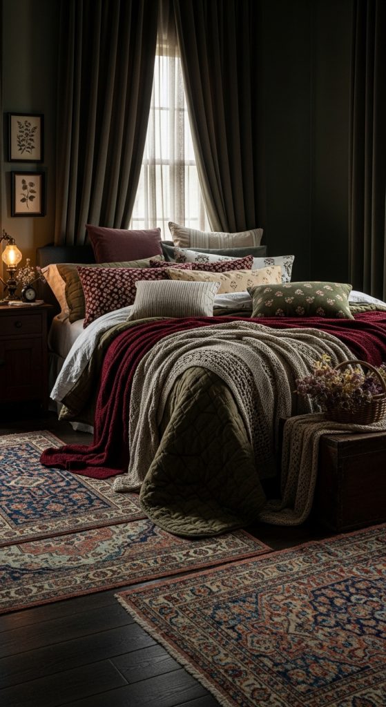 For bedding, choose deep-colored duvets or quilts in shades like burgundy, olive green, or dark brown. Add lighter sheets underneath in cream or soft beige for contrast. Layer multiple blankets at the end of the bed. A knitted throw or crocheted blanket adds a handmade touch.