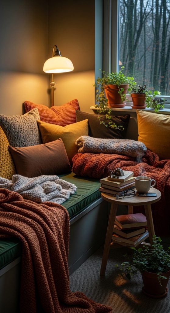 Layer soft blankets and cushions in dark, rich tones. Add a small wooden side table for books and tea. Place a warm lamp nearby to create gentle lighting. If possible, position the corner near a window so you can enjoy natural light during the day.