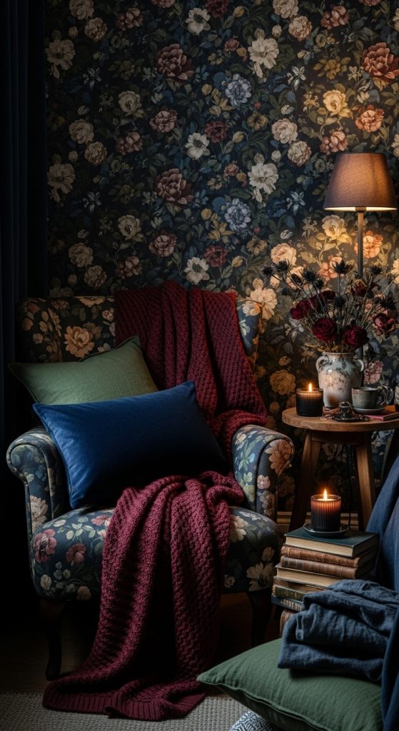 If wallpaper feels overwhelming, add floral patterns through bedding, curtains, or cushions. Upholstered headboards with dark floral fabric create a strong focal point in bedrooms. In living rooms, floral armchairs or ottomans add character.