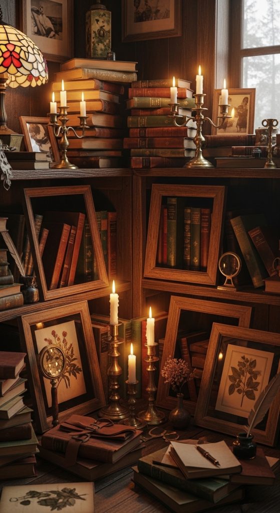 You can also frame pressed leaves or botanical prints. To make your own pressed art, place leaves between heavy books for several weeks. Once flat and dry, arrange them in simple wooden frames. These small natural details strengthen the connection between your indoor space and the forest-inspired mood of dark cottagecore.