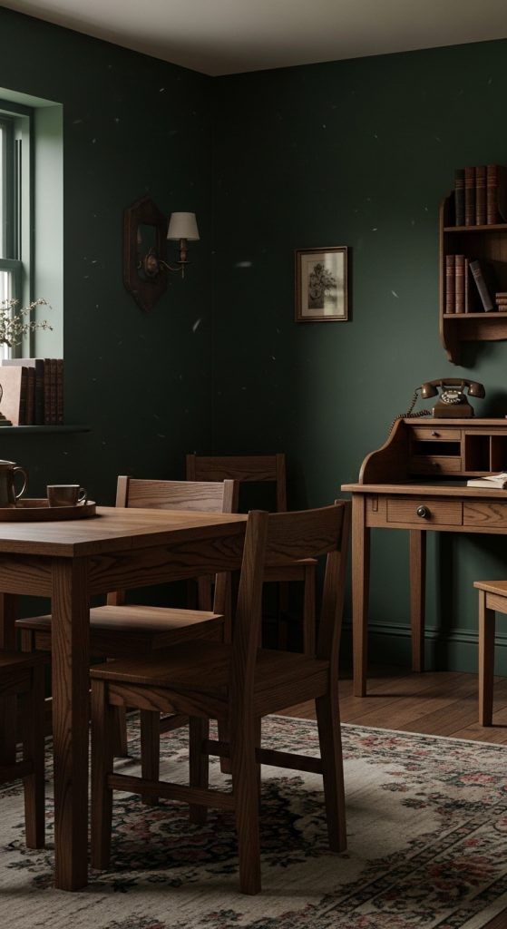 The foundation of dark cottagecore decor begins with color. Before adding furniture and accessories, prepare your walls and large surfaces with deep, earthy tones. Good choices include forest green, deep navy, warm brown, charcoal gray, and muted plum. These colors create a calm and grounded feeling that fits the countryside mood.