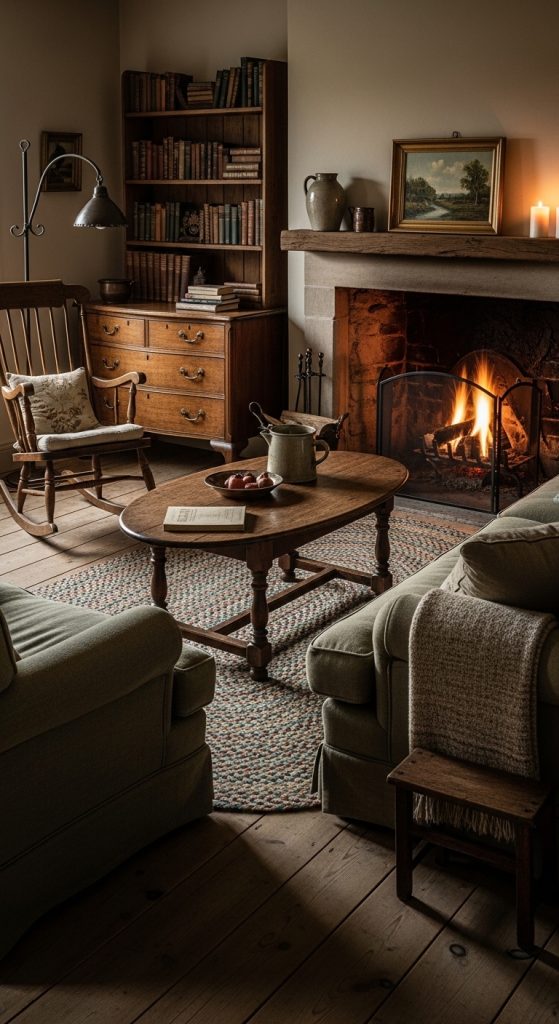 Upholstered chairs and sofas should have natural fabrics like cotton or linen in dark florals, plaid, or solid earthy shades. You can reupholster seats with thicker fabrics if you want a more authentic look. The key is comfort. Choose furniture that invites you to sit down with a book, drink tea, and relax.