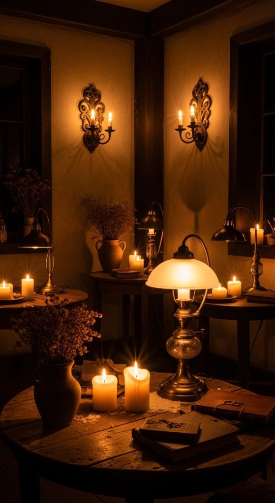 Start by replacing harsh ceiling lights with softer alternatives. Table lamps with fabric shades, antique-style floor lamps, and wall sconces work beautifully. Look for brass, bronze, or black metal finishes. These materials match the darker color palette.