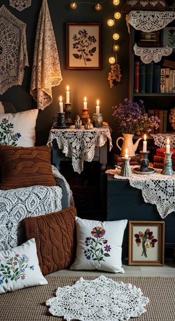 Handmade items add authenticity to dark cottagecore decor. Crafting your own pieces makes your space more personal and meaningful. Simple projects like crocheted doilies, knitted scarves, or embroidered pillowcases can make a big difference.