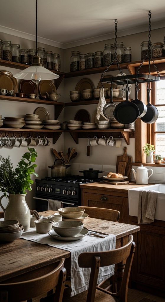 The kitchen is an ideal place to express dark cottagecore style. Focus on natural materials and visible storage. Open wooden shelves are a beautiful and practical option. Install sturdy brackets and solid wood planks, making sure they are securely attached to wall studs.