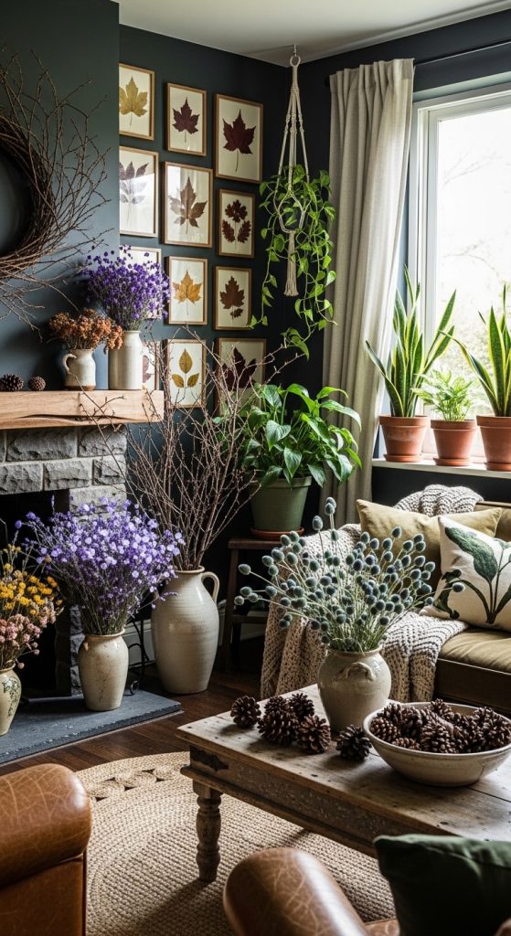 Dark cottagecore is deeply connected to nature. Bringing natural elements indoors is essential. Use dried flowers, branches, pinecones, and pressed leaves to decorate your home. These details create an organic and slightly wild feeling.
