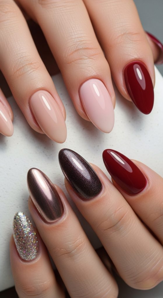The right color and finish can elevate almond nails from simple to sophisticated. Neutral tones such as nude, beige, and soft pink highlight the nail’s natural shape, giving a classy and understated look. Darker shades like deep reds, burgundy, and navy add a luxurious feel, especially for evening occasions.