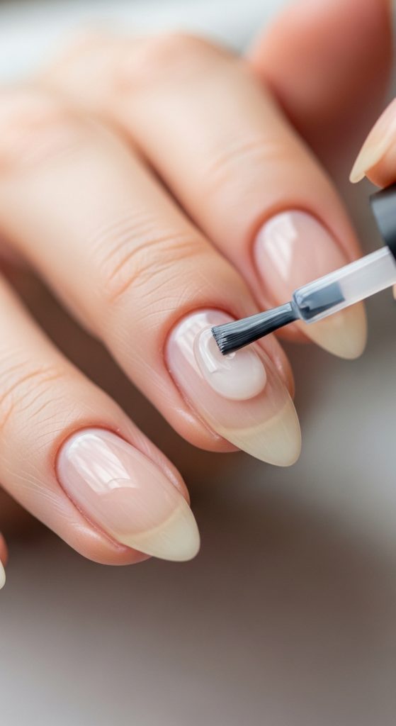 Apply a thin, even layer to prevent thick buildup, which can make shaping or polish application uneven. Allow the base coat to dry fully before applying color. For gel nails, use a gel base coat and cure under a UV or LED lamp as per product instructions. Some base coats also offer ridge-filling properties, giving a smoother surface for your polish or nail art. Proper base preparation ensures long-lasting color, prevents chipping, and protects nails from damage, maintaining the elegance of your almond shape.