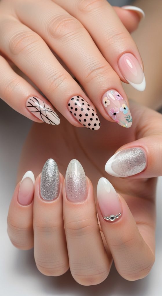 Almond nails offer a perfect canvas for creative designs. Minimalist art such as thin lines, dots, or geometric patterns enhances elegance without being overwhelming. Floral designs add a delicate touch, ideal for spring or summer. French tips are particularly flattering on almond nails, emphasizing the taper and length.
