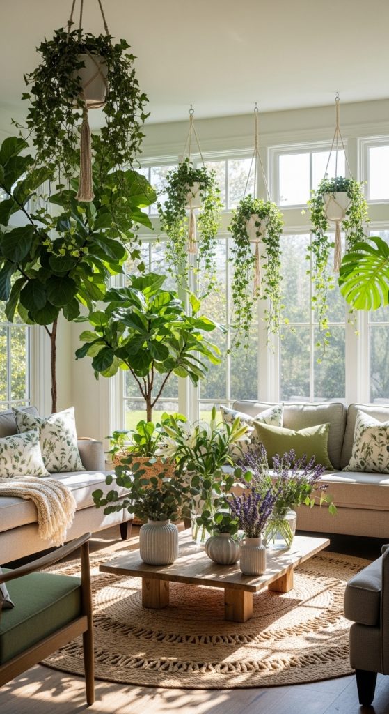 Wooden furniture, bamboo accents, or natural fiber rugs integrate natural textures, creating warmth and visual balance. Combining natural materials with elegant textiles and metallic accents produces a sophisticated contrast. Regular care, such as watering, pruning, and cleaning, ensures plants remain healthy and vibrant. Incorporating greenery and natural elements not only improves the visual appeal of your living room but also contributes to a more serene and elegant atmosphere.