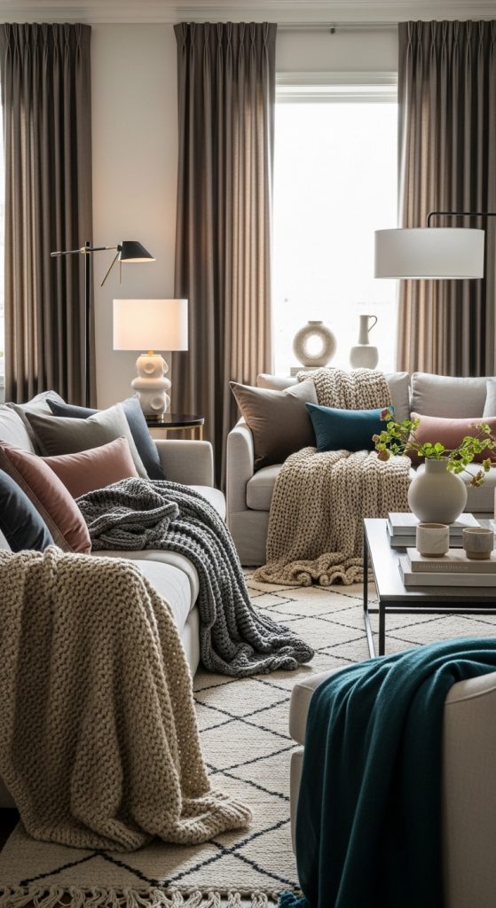Textiles are one of the easiest ways to introduce elegance and comfort into a living room. Soft curtains, area rugs, throw blankets, and decorative pillows can transform a space by adding layers of texture, color, and pattern. Opt for high-quality materials such as silk, velvet, linen, or wool to convey sophistication and richness.