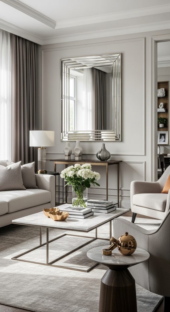 Mirrors are a powerful tool for creating the illusion of space and adding elegance. A well-placed mirror can reflect natural light, brighten dark corners, and make a room appear larger than it is. Decorative mirrors with ornate frames or sleek modern designs can double as artwork, enhancing the overall sophistication of your living room.