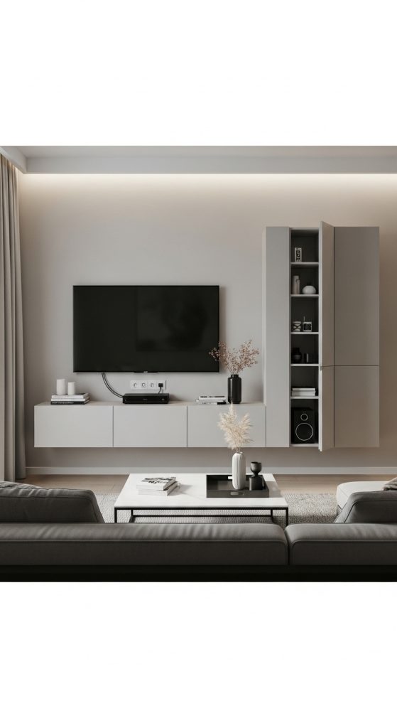 In narrow living rooms, floating TV units help maintain a streamlined layout while providing essential storage and entertainment functionality.