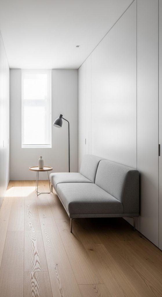 A slim sofa helps maintain openness in a narrow living room. It provides comfortable seating while keeping the layout simple and uncluttered.