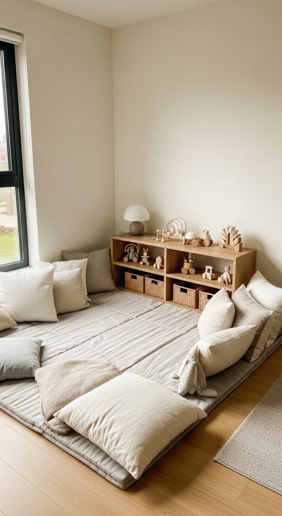 To create this setup, start by selecting a corner that receives moderate natural light and is easily visible from main seating areas. Place a thick soft mat as the base layer to define the play boundary. Add floor cushions or bean-style seating to create flexible seating options. Install a small low shelf or storage basket system along the wall to organize toys and books efficiently. Ensure materials are lightweight and easy to move for daily cleaning. Decorative elements such as wall decals or fabric banners can be added to make the space visually engaging for children. Keep storage within reach to encourage independent cleanup habits. The entire setup should remain flexible so it can be adjusted as children grow or interests change. This DIY approach makes it a beginner friendly solution that balances safety, aesthetics, and functionality within a shared living space environment.