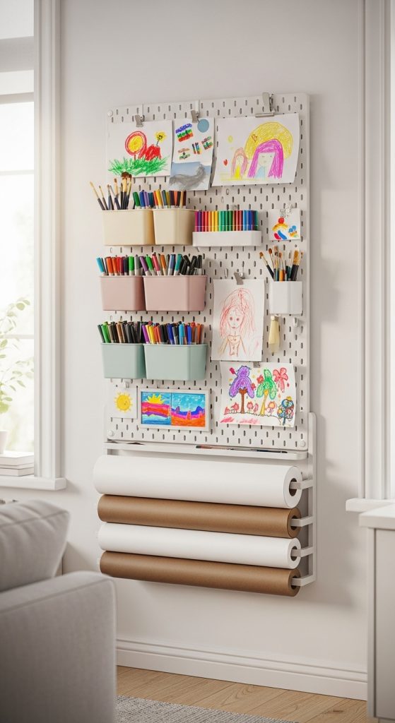 Start by selecting a wall that is easily accessible and visible from the main seating area. Install a pegboard or wall grid system to hold art supplies such as crayons, brushes, and paper rolls. Add small shelves or mounted containers for organized storage of materials. Ensure all elements are installed at a child-friendly height for easy access. Place a small foldable stool or standing mat below the station to define the working area. Organize supplies by category to maintain clarity and encourage independent use. Incorporate clips or display lines to showcase completed artwork, adding a personalized decorative touch to the living room. This DIY setup supports structured creativity while maintaining a clean and efficient use of space, making it an ideal easy project for modern family homes.
