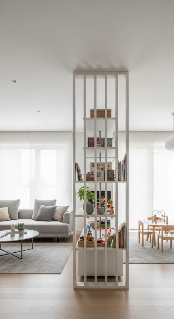 Select a lightweight divider system that is safe, stable, and visually compatible with the living room design. Position it to separate the play area from the seating or entertainment zone. Add shelves or storage compartments within the divider for toys, books, or activity materials. Ensure accessibility for children while maintaining organization. Decorate sections with soft colors or simple patterns to enhance visual appeal without overwhelming the space. Keep the structure open enough to allow supervision while still defining clear zones. This DIY setup provides structured organization and improves spatial efficiency within a shared living environment.