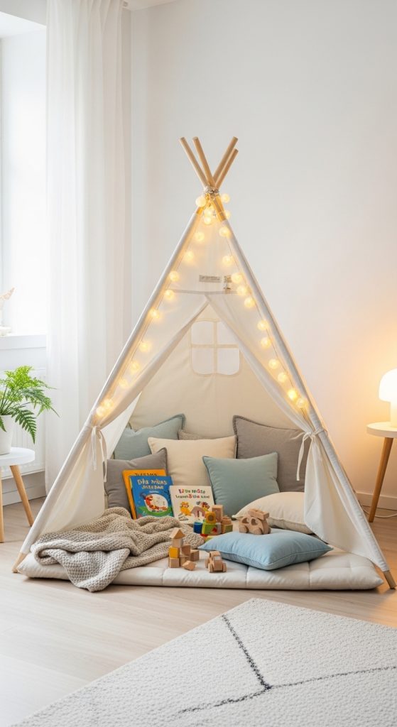 Choose a lightweight tent frame or fabric canopy that fits comfortably in a corner of the living room. Place a soft mat or rug underneath to create a comfortable base. Add cushions, small bookshelves, or toy baskets inside the tent to encourage structured play. Ensure the tent remains stable and safe for children during use. Keep lighting soft and warm to create a calming atmosphere. The space should remain uncluttered to maintain its cozy appeal. This setup allows children to enjoy independent play while staying within supervised view, making it an effective and adaptable solution for modern living spaces.