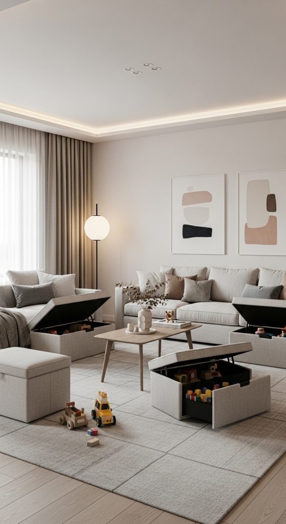 Select ottomans with strong storage capacity and safe closing mechanisms suitable for children. Position them near the main seating area to ensure easy access. Use internal compartments to organize toys by category, separating smaller items into containers for better structure. Rotate toys regularly to keep the play experience engaging and organized. Encourage children to return items to storage after use, reinforcing cleanup habits. The ottoman surface can also be used for sitting or light play activities, making it a multifunctional element within the living room. This DIY organization method supports both functionality and aesthetics while keeping the space tidy and visually balanced for daily family living.