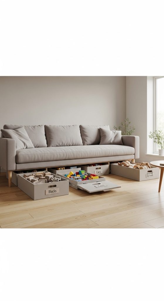 Measure the space under the sofa to determine suitable storage container sizes. Choose low-profile bins or drawers that slide easily without damaging flooring. Organize toys by category inside each container for better accessibility. Label containers to simplify cleanup routines for children. Store frequently used items in the most accessible bins. Encourage regular tidying habits by making storage part of daily routines. This system maintains a clean living room while ensuring play materials remain easily accessible when needed, making it a highly efficient organization method.