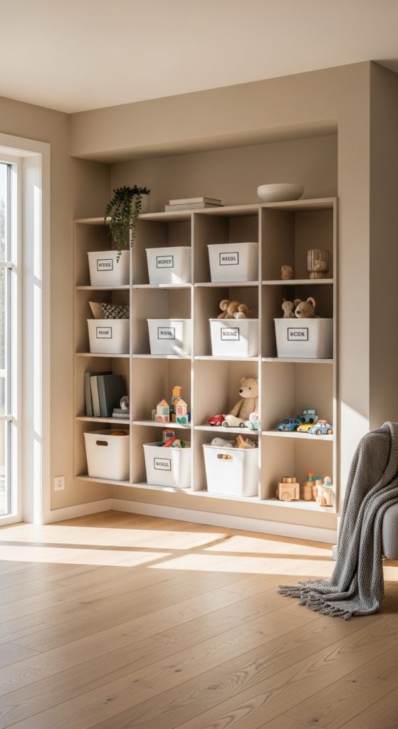 Begin by measuring the available wall space and selecting modular cube units that fit proportionally within the living room layout. Assemble the cubes and secure them safely against the wall for stability. Assign each cube a specific category such as toys, books, art supplies, or games to encourage organized storage habits. Use labeled bins or baskets inside the cubes to simplify cleanup and improve visual consistency. Lower cubes should be reserved for children’s access, while upper sections can store less frequently used items. Add decorative elements like soft lighting or framed artwork on top of the structure to integrate it with existing home decor. Maintain a balance between storage and open space to avoid a heavy visual appearance. This DIY organization method supports easy project execution and helps maintain a structured yet playful environment suitable for everyday family use.