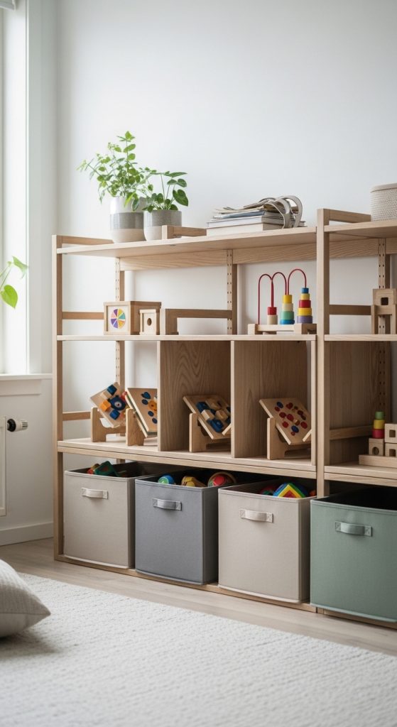 Set up a dedicated shelving unit within the living room and divide it into sections for different toy categories. Rotate items weekly or monthly to maintain interest and reduce clutter. Store unused toys in separate containers to keep the display organized. Place shelves at accessible heights to encourage independent selection and cleanup. Maintain a consistent rotation schedule to ensure variety and engagement. This DIY method supports structured organization, creativity, and long-term usability within a shared family environment.