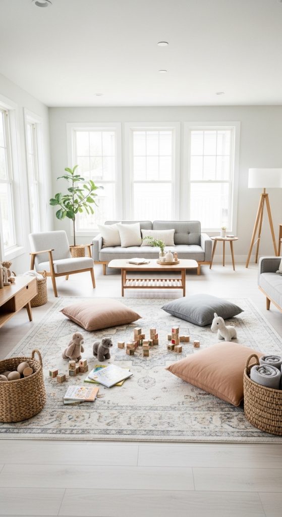 A play rug zoning system uses a dedicated rug to visually define a kid play area within the living room without adding physical barriers. This idea is highly popular in Pinterest ideas because it is simple, flexible, and budget friendly. The rug acts as a visual anchor that separates play space from adult seating areas while maintaining an open layout. It supports minimalist style interiors by avoiding bulky furniture or partitions. The design works well for both small and large living rooms since it can be adjusted easily based on available space. The rug can also enhance home decor by introducing soft colors or playful patterns that appeal to children while still blending with overall room aesthetics. This approach allows parents to maintain supervision while keeping the environment visually organized and structured, making it a practical solution for everyday family living.