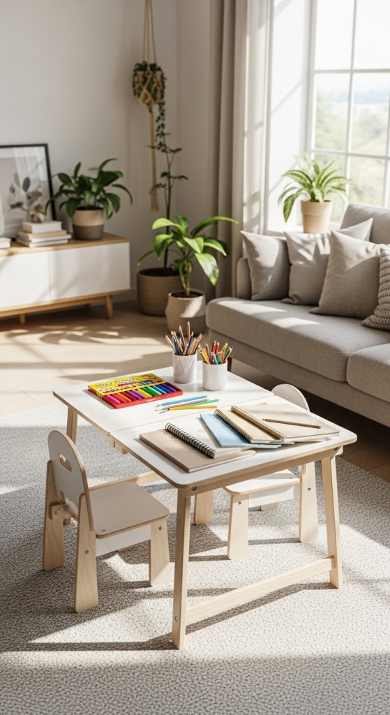 A foldable activity table zone introduces a flexible workspace within the living room dedicated to drawing, crafts, and learning activities. This setup is ideal for families seeking space saving solutions that align with modern design and minimalist style interiors. The foldable feature ensures the table can be stored when not in use, keeping the living room uncluttered. This concept is frequently featured in Pinterest ideas because it supports multifunctional living spaces. The activity zone encourages creativity while maintaining order, making it suitable for both structured learning and free play. It also integrates well with DIY planning since it requires minimal installation. The table can be paired with lightweight chairs or floor seating to increase flexibility. By incorporating organized storage nearby, children can independently access materials and return them after use, promoting responsibility and structured habits within a shared home environment.