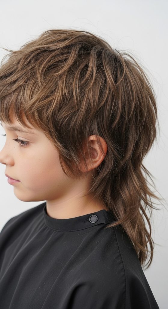 A textured layered mullet introduces depth and dimension to the classic design by incorporating multiple layers of varying lengths. This creates a more dynamic look, allowing the hair to move freely while adding volume and character. Layers can be subtle for minimalist styles or pronounced for aesthetic statement designs, making this adaptable for both casual and creative inspiration. Textured mullets work well for children with medium to thick hair, as layering reduces bulk and improves manageability. This approach highlights the creative potential of a DIY hairstyle, offering a practical balance between maintenance and style.