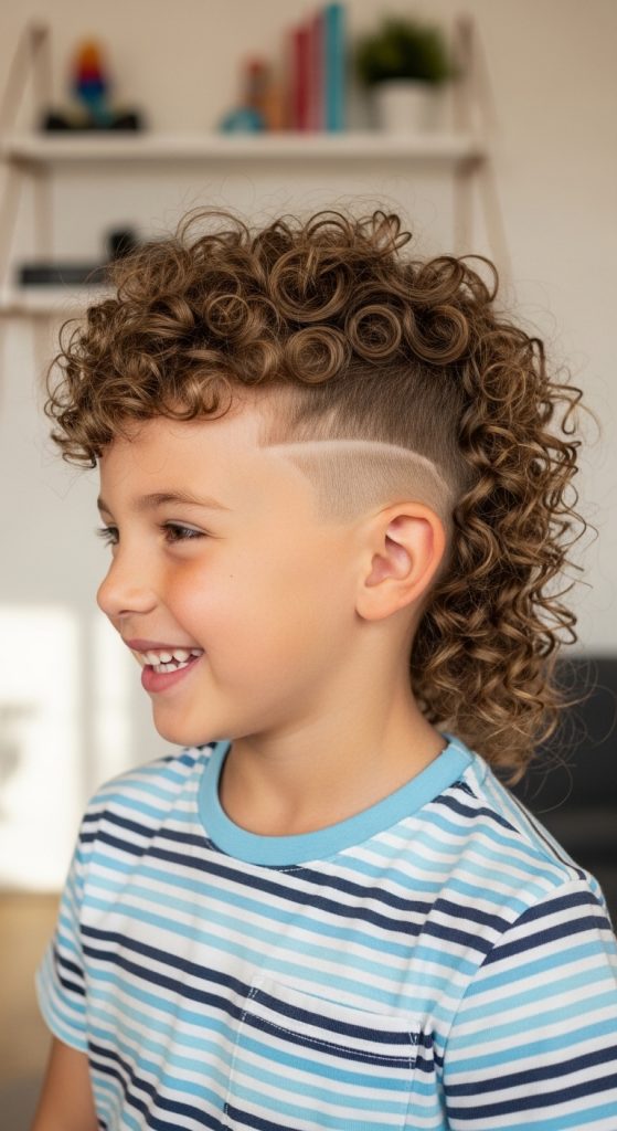 Curly kids mullets emphasize natural curl patterns, combining the modern mullet’s structural shape with a child’s natural hair texture. This design highlights curls in the longer back while keeping the front and sides manageable. Curly hair adds volume and movement, making each mullet unique. Maintaining the curl’s integrity while shaping the haircut requires careful trimming, with attention to curl clumping and shrinkage. This style enhances natural hair characteristics without forcing unnatural straightening, aligning with a modern minimalist style and aesthetic Pinterest ideas.