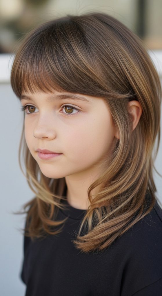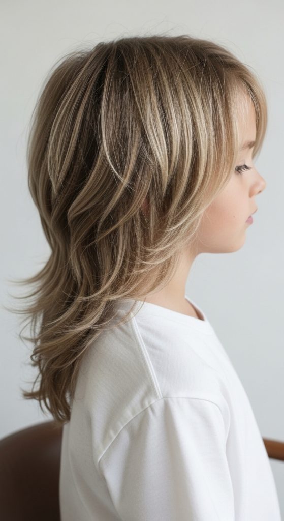The feathered modern mullet emphasizes soft, wispy layers throughout the top, sides, and back, creating a light, flowing look. This approach reduces heaviness, particularly in thick hair, while enhancing movement and texture. Feathered layering is beginner-friendly with careful trimming, producing an aesthetic reminiscent of modern home decor-inspired minimalism. It suits children who enjoy subtle sophistication without overcomplicated styling. Feathering enhances volume control and allows hair to adapt naturally to different environments, reflecting both practicality and creative Pinterest-style inspiration.