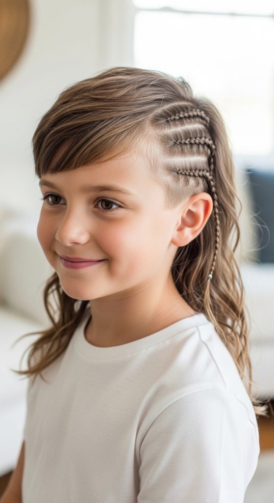 A braided accented mullet combines the functional modern mullet with small braid details for creative flair. This approach adds visual interest while keeping hair manageable, particularly for children with thick or long hair. Braids can vary from single thin accent lines to multiple micro braids, depending on preference and skill level. This version merges DIY creativity with modern design principles, making it ideal for Pinterest boards focused on stylish yet practical children’s hair projects. Braiding also introduces a beginner-friendly challenge, encouraging engagement with simple styling techniques.