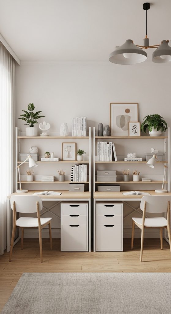 To create this layout, divide the room into equal sections using furniture placement. Two desks can be placed side by side or in parallel positions depending on room shape. Individual storage units should be assigned to each user to avoid confusion. Neutral design elements help maintain visual harmony across the shared space. Proper lighting and noise management are essential for maintaining concentration. This setup is practical, functional, and suitable for families or shared living environments.
