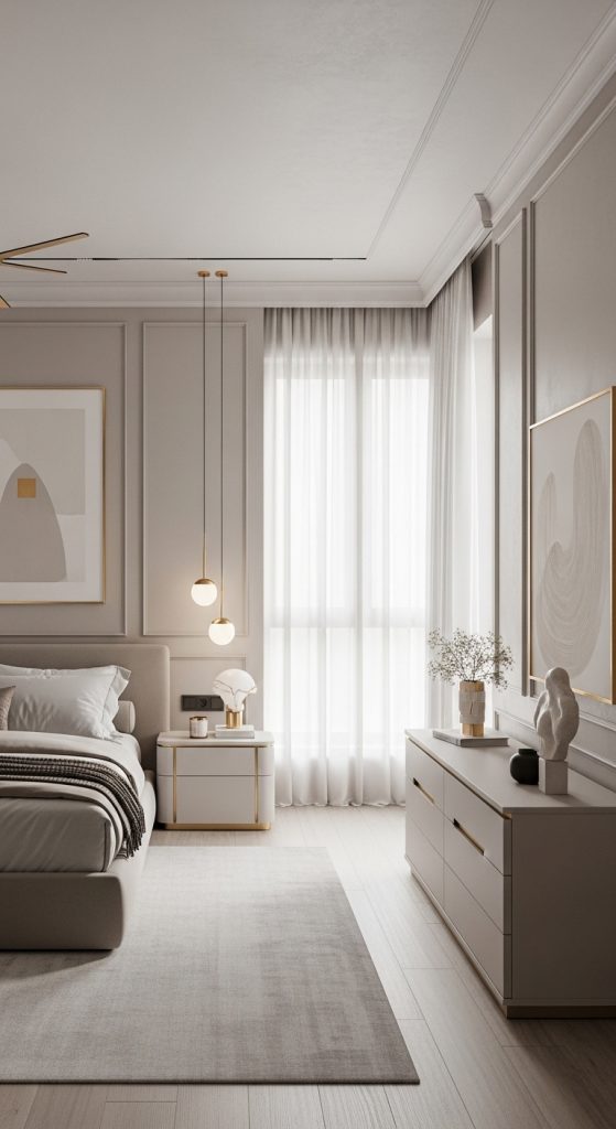 Finally, the finishing touch for a modern luxury bedroom is personalized decor. Decorative accents like vases, candles, books, and curated collections create character and warmth. Metallic accessories, high-end ceramics, or designer objects can reinforce the luxurious aesthetic.