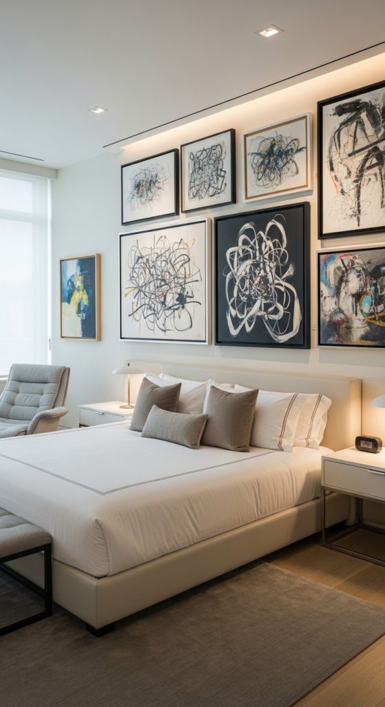 Art adds personality and sophistication to a luxury bedroom. Large-scale paintings, sculptures, or curated wall art can serve as statement pieces. Abstract art works particularly well in modern spaces, while monochrome photography or subtle prints complement a minimalist aesthetic.