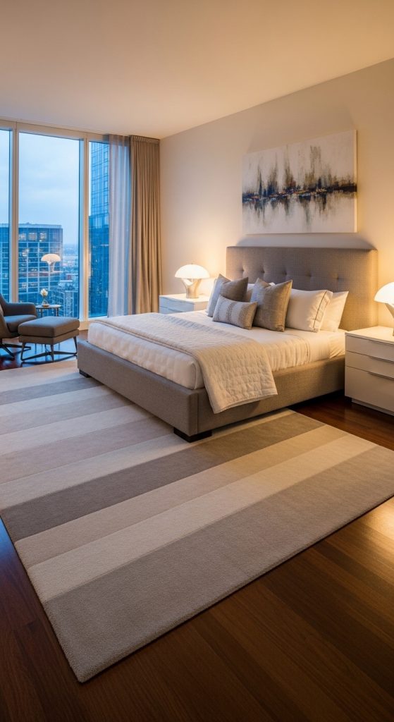 Flooring is often overlooked, but in a luxury bedroom, it significantly affects the overall ambiance. Hardwood floors, natural stone, or high-quality engineered wood are ideal choices for modern luxury bedrooms. These materials provide durability, comfort, and a timeless aesthetic. For a softer feel underfoot, layer with plush area rugs in complementary colors and patterns.