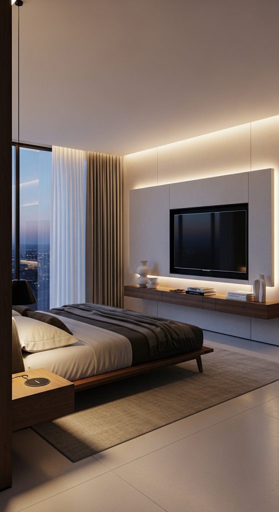 Modern luxury bedrooms often include smart technology for convenience and comfort. Smart lighting, automated window treatments, and climate control systems allow for effortless adjustment of your environment. Built-in speakers or smart TVs can provide entertainment without cluttering the space.