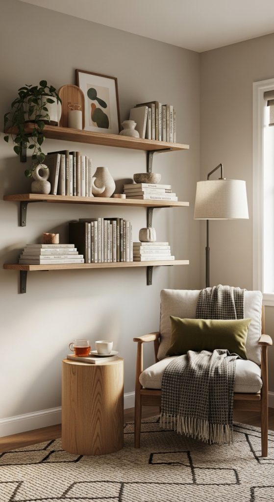 Floating shelves save floor space and create visual interest without overwhelming the room. They are practical, stylish, and perfectly aligned with the organic modern aesthetic.