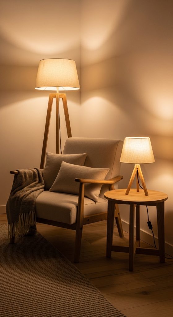 A floor lamp with a wooden or metal base works well. Look for simple shapes and neutral shades. Linen lampshades soften the light and complement organic materials. Place the lamp beside your chair to avoid shadows while reading.