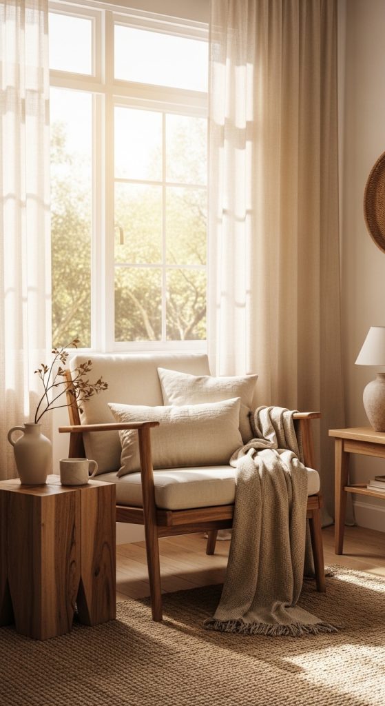 Add sheer linen curtains to soften the sunlight. These allow natural light to enter while maintaining privacy. You can also include a small wooden side table to hold books or a cup of tea.