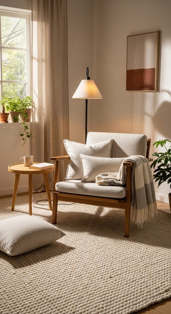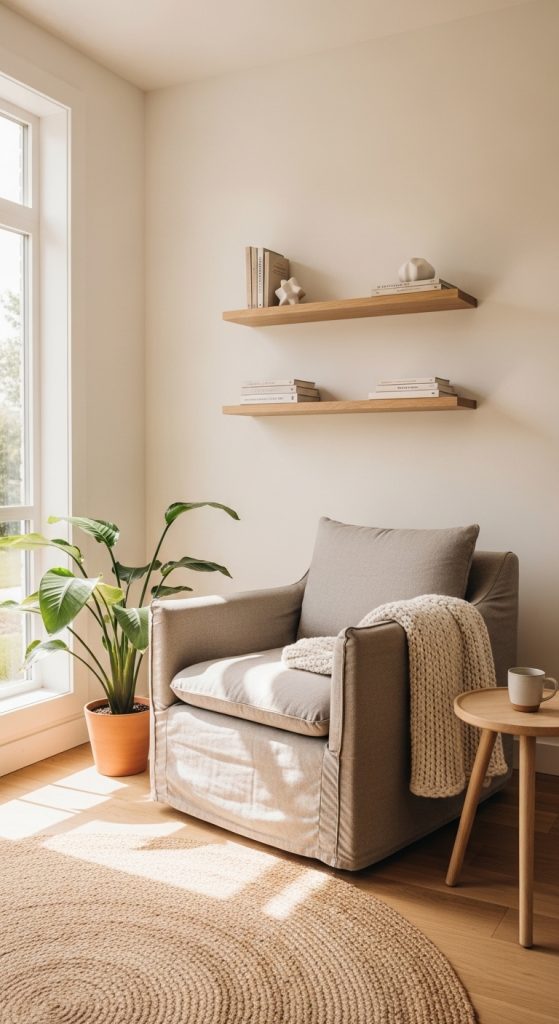 Place a comfortable armchair or a built-in bench near the window. Choose materials like solid wood, linen upholstery, or cotton cushions. If you install a bench, use plywood or solid wood for the base and top it with a thick foam cushion covered in neutral fabric. Light colors such as beige or soft gray work best.