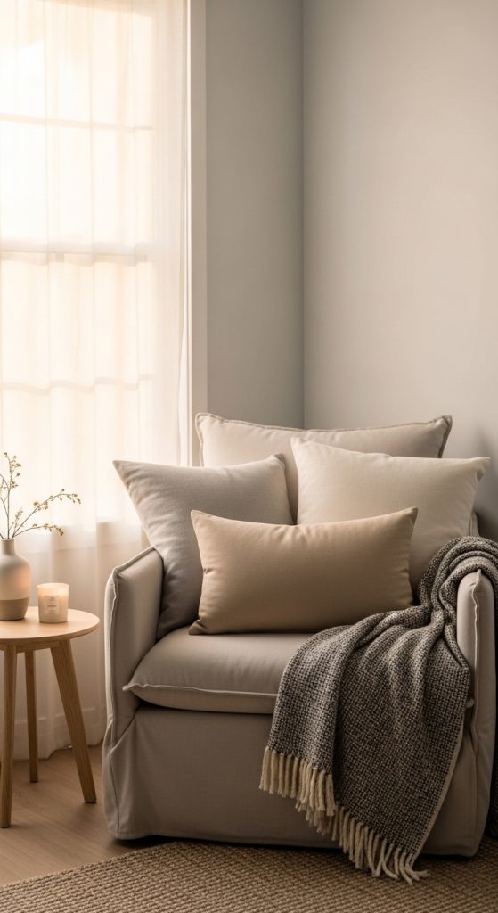 Select cushions in different textures but similar color tones. For example, mix smooth linen with knitted wool. Keep the color palette simple with cream, beige, soft gray, or muted green. Avoid bright or shiny materials.