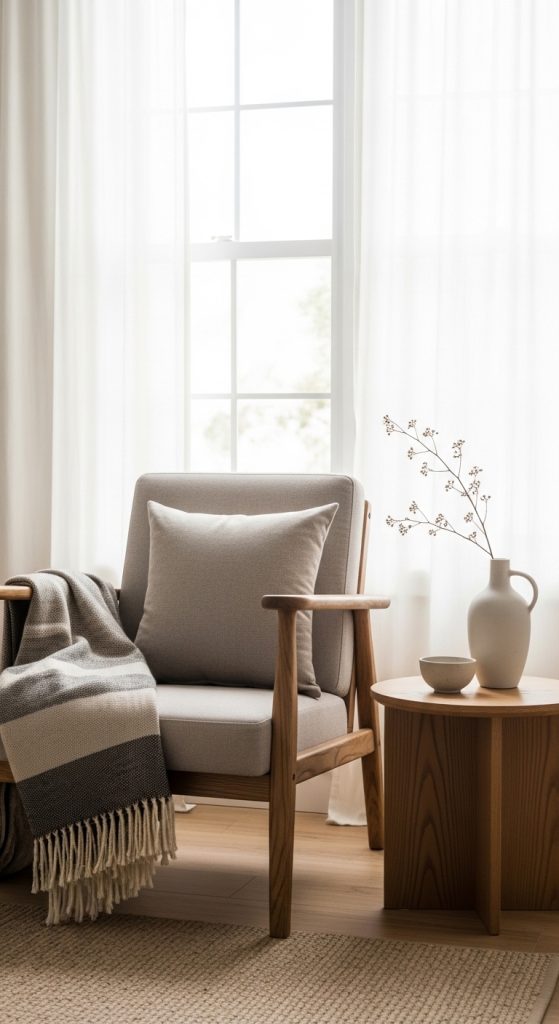 A simple side table makes the nook practical and complete. It supports daily use without compromising style. This balance between beauty and function defines organic modern interiors.