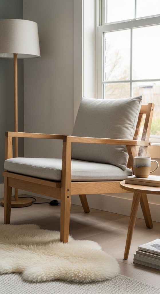A wooden armchair with a modern shape can become the focal point of your reading nook. Look for a chair made from oak, walnut, or ash wood. The frame should have clean lines and a smooth finish. Avoid heavy carvings or complex designs.