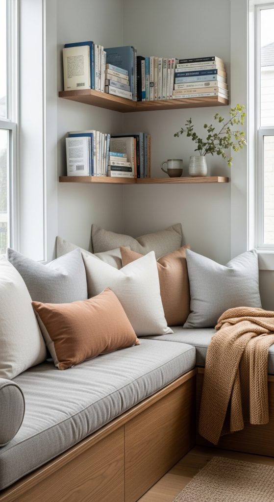 Install drawers or storage underneath for books or blankets. This keeps the area organized and clutter-free. Add floating shelves above the bench for additional storage.